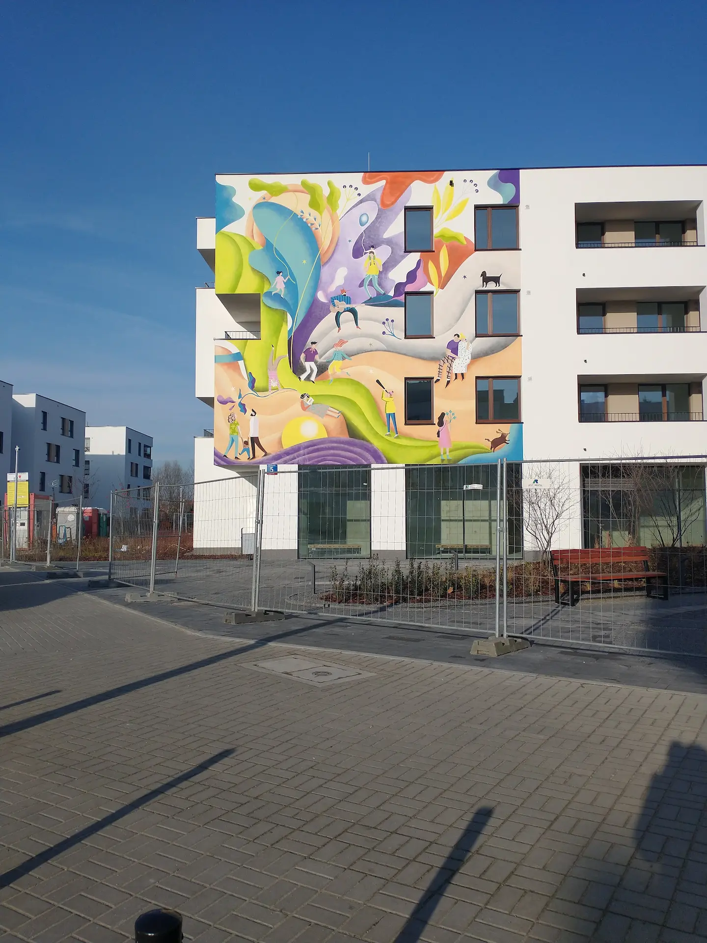 Malunek naścienny został stworzony dla nowej deweloperskiej inwestycji, co podkreśla nowoczesny i przyjazny charakter osiedla. Autorką projektu muralu jest Ania Rudak, która w swoim stylu doskonale połączyła elementy przyrody z miejską przestrzenią, nadając budynkowi unikalny wygląd.