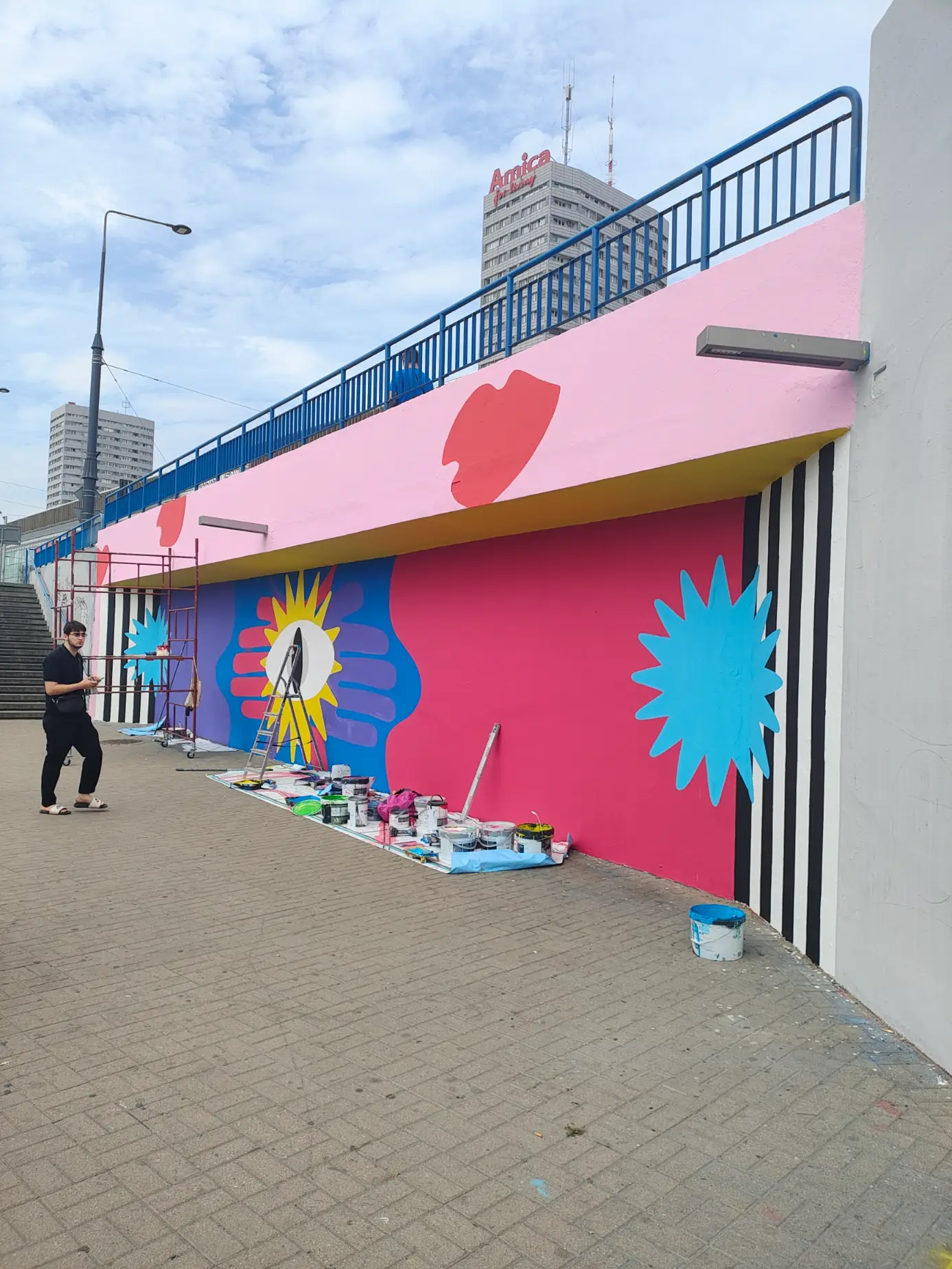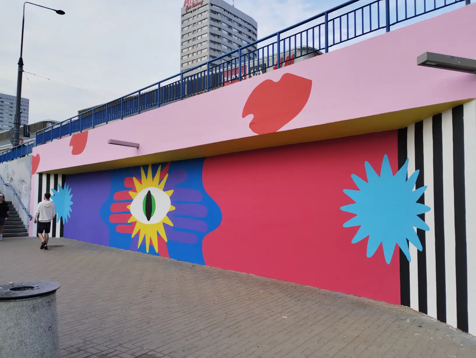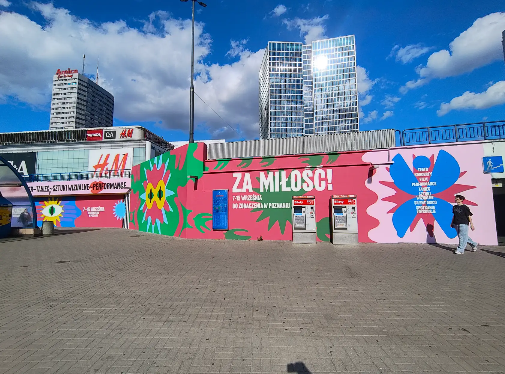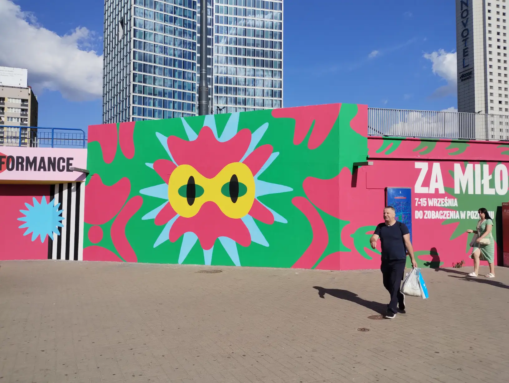 W przestrzeni miejskiej Warszawy pojawił się barwny mural promujący Festiwal Malta w Poznaniu. Dynamiczna kompozycja w intensywnych kolorach – różu, zieleni i błękitu – przyciąga uwagę przechodniów i wpisuje się w energiczny, artystyczny charakter wydarzenia. Hasło „ZA MIŁOŚĆ!” podkreśla ideę festiwalu, który łączy teatr, taniec, sztuki wizualne, film, koncerty i performance.