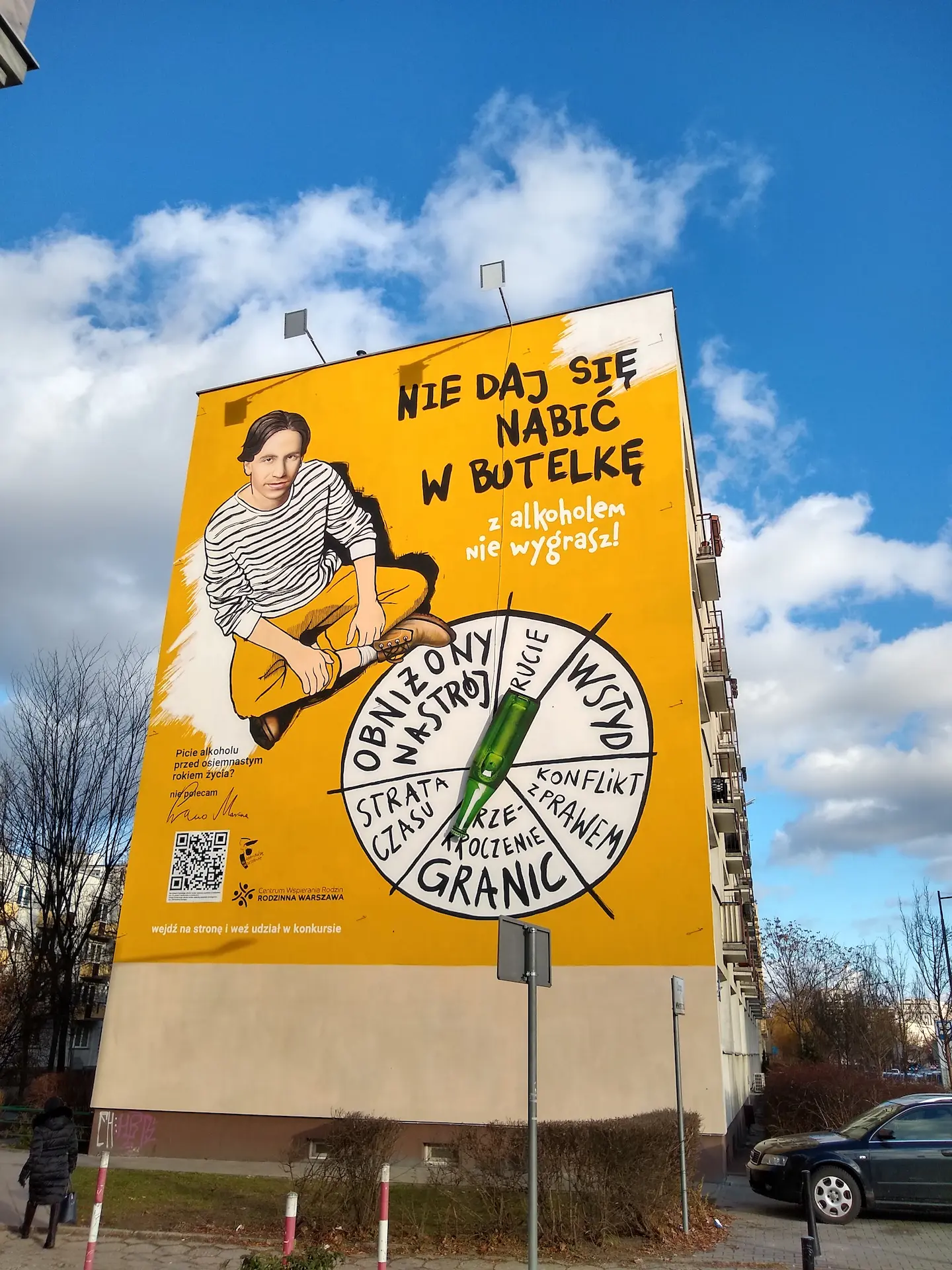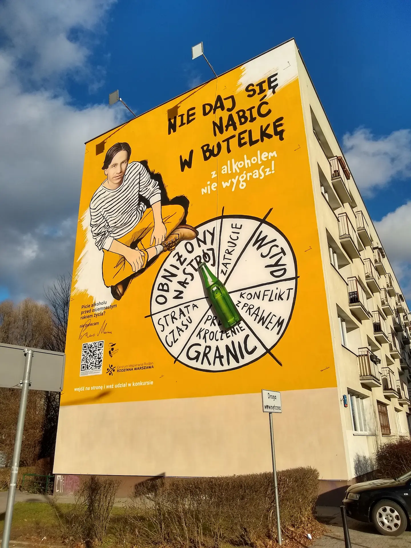 Ten mural znajduje się w Warszawie i jest częścią kampanii antyalkoholowej, skierowanej głównie do młodzieży. Jego główne przesłanie to: „Nie daj się nabić w butelkę – z alkoholem nie wygrasz!”, co w humorystyczny, ale zarazem dosadny sposób ostrzega przed negatywnymi skutkami picia alkoholu przed osiągnięciem pełnoletności.